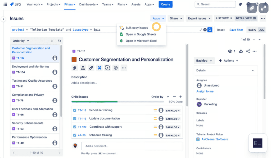 - Elements Copy & Sync can clone the entire workspace, including all epics, issues, and their relationships.
