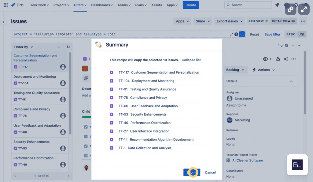 - Use Elements Copy & Sync to clone and sync your templates with predefined epics and issues.