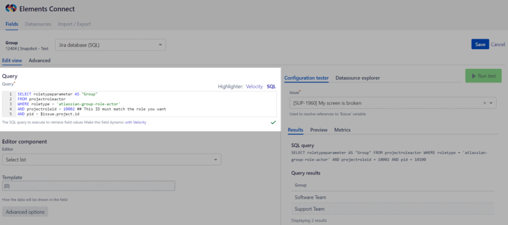 Work around solutions like using a native select list as a substitute group picker require all the configuration to be done by the Jira admin and is particularly tedious, especially when the options have to be configured one by one for tens or hundreds of projects. Elements Connect helps delegate list administration by allowing the Jira admin to set up a standard SQL query for the Elements Connect custom field that applies to all projects, but fetches different data depending on the project. “Elements Connect allows us to delegate the list administration to the Project admin, instead of the Jira admin,” explains Romain Deguil. The project administrators for each Jira Service Management project configure which user groups apply to the project in question, add them to the role “Assignable team” for the project, and can modify the groups in the role whenever the need arises.