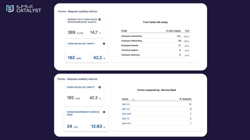 With the introduction of Jira Forms analysis in Elements Catalyst, service owners, IT teams, and support managers can finally evaluate how forms are used, field by field, and how they contribute to (or slow down) request resolution. It’s a game changer for those looking to move from traditional SLA-focused to customer-centric service management and continuous service improvement..